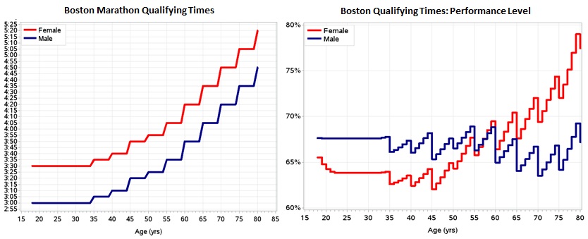 The Boston Marathon qualifying process essentially uses a version of age standard times to determine who can apply for a race (that is, outside of a separate pathway that generates valuable support for many charities). The extra wrinkle is that the number of qualified applications always exceeds the race capacity and only the fastest qualifying applicants get in. When Boston Marathon announced a tentative plan to have a 2021 race in October but with a greatly reduced number of runners, there were a lot of folks who have qualifying times but were sad to figure out they could not get in with the smaller field size (Happy Aging Runner is one of these).