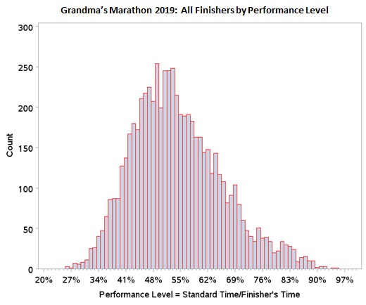If people had a better understanding of age adjustment, would an official shirt with the runners age-adjusted performance value be almost as good as a jacket with the Boston unicorn? The graph below shows how all finish times (all ages, male and female) from the 2019 Grandma’s can be compared using this single measure.
