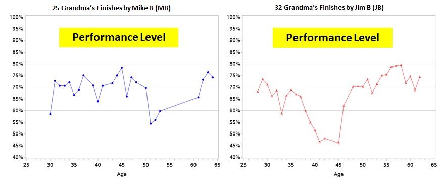 The next set of graphs are a longitudinal study of two outstanding local runners who ran Grandma’s in most of the 35 years from 1985 to 2019: Mike B (25 times), who I know well, and Jim B (32 times), who I do not. Mike was 64 in 2019 and the top finisher among 64-year-old males. Jim was 62 and the second fastest 62-year-old male finisher. The upper graph shows their times plotted by age when ran. The lower graph is their age-adjusted performance level, which is a percentage calculated by dividing the AgeStd time by the runner’s time (a higher percentage is a better performance).