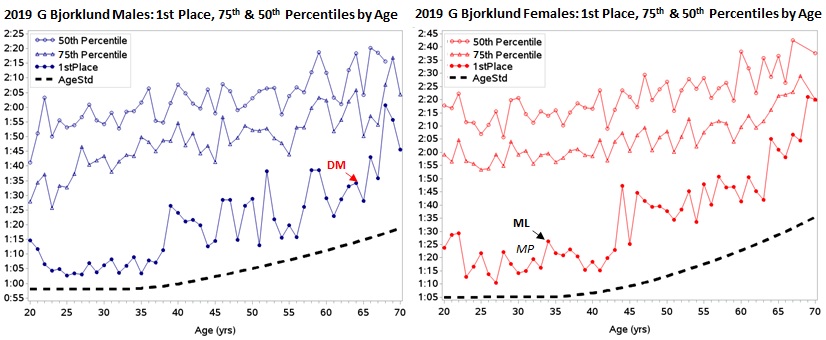 The dashed line near the bottom of each graph is the 2020 update of the “Age Standard (AgeStd)” times from the USATF, which are used to generate official age-adjusted times for their Masters Long Distance Running events. Notice how all three plots have a shape that resembles the AgeStd curve. The distance from the dashed AgeStd line corresponds to the age-adjusted time. For both males and females, the overall race winner (marked “A”) was not the age-adjusted winner (“B”).
