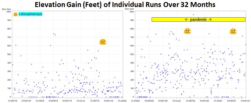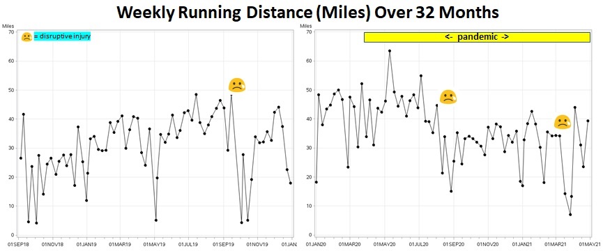 I use a Garmin running watch, which uploads to an online Garmin database, at least when no cyber criminals have conducted a ransomware attack on Garmin (as happened in July of 2020). Using this online database, it is easy to export a file with a few metrics from all or any subset of your runs. I chose to explore 32 months of my recent history because I think I can remember the key details of all running injuries I suffered during that time.