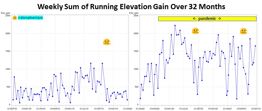 Part of the explanation for my hamstring injuries might be a change that occurred in my running during the pandemic that making these graphs showed was more dramatic than I had realized. I started running a lot more straight out the door of my home, which is in an area that is much hillier than where I mostly ran pre-pandemic. The next two sets of graphs show the elevation gain during individuals runs and cumulative elevation gain by week (my Garmin watch calculates elevation change from barometric pressure changes). You can see I had a huge increase in the amount of hill-climbing. (I should explain that the runs with elevation change of zero were indoor runs. I occasionally run on a treadmill, typically when there is a blizzard or a rainstorm happening. In the winter of 2019-20 I discovered that a nearby high school allowed people in the community to use their indoor track during certain hours, a better option than the treadmill but an option that went away with the pandemic. My Garmin watch estimates indoor run distance using its accelerometer/step-counter and usually is quite accurate.)