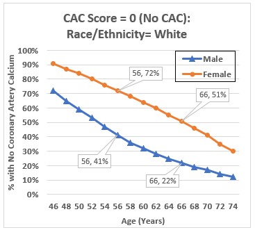 Figure 4 plots the percentage of white MESA study participants by sex and age who had a CAC score of zero at the start of the study. I obtained these numbers by plugging race/ethnicity, sex, and age into the reference values calculator on the MESA website. Calcium Calculator (mesa-nhlbi.org)