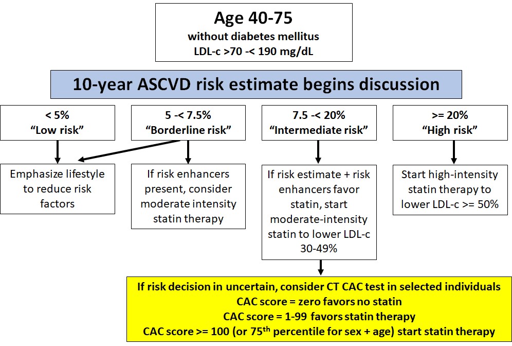 - May use a CAC score in one specific circumstance – a patient categorized as “Intermediate risk” for whom the “decision is uncertain.”