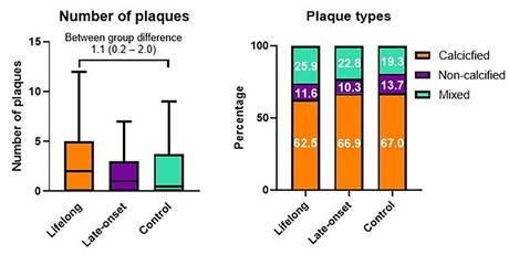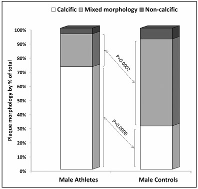 - As shown in Figure 7 (part of Figure 2 in the article), compared with the controls, the lifelong athletes were more likely to have a larger total number of plaques and have a SMALLER proportion that were calcified plaques. In other words, their findings about plaque composition contradicted those of the Merghani and Aerngevaeren studies.