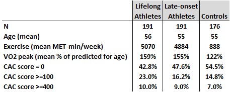 Table 7 describes the sample of 21,758 men by CAC score and physical activity volume categories. 24.4% had a CAC score >=100. 7.2% reported 3,000 or more MET-minutes per week of physical activity. The authors state, “No specific question defined whether these exercisers are in fact competitive athletes (e.g., regular marathon runners)… The mean physical activity volume in the most highly active group was slightly more than… equivalent to running 6 miles/day at a pace of 10 minutes per mile… This exercise volume is consistent with the weekly distances proposed for and practiced by many masters marathon runners.”