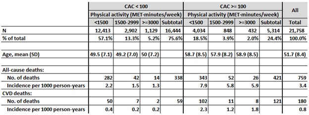 - Among men with a CAC score >= 100, those with >= 3000 MET-mins/week of physical activity did not have an increase in all-cause mortality compared with those with < 1500 MET-mins/week.