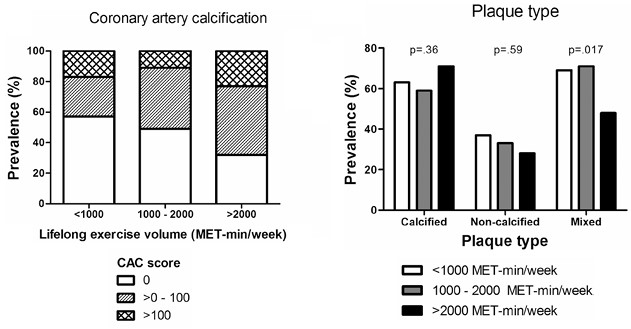 - Those in the highest exercise volume group who had plaques, were more likely to have predominantly calcified plaques (those with lower exercise volume were more likely to have mixed or non-calcified plaques).