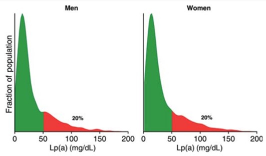Figure 13 shows the distribution of Lp(a) levels in the general population. Most individuals have Lp(a) levels within a fairly small range (green area in the figure) but there is a long right “tail” in the distribution (red area), consisting of individuals with the much higher Lp(a) levels that have been shown to increase risk for CAD. (Reference 18)