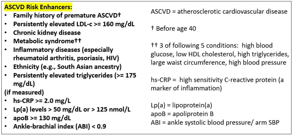 - Incorporates any additional known “risk enhancers” for the patient (factors not included in the risk equations), and
