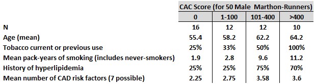 The second publication from this study (2017, in a different journal) described CAC scores for the same 50 marathon-runner subjects and explored differences in history and clinical risk factors among the runners grouped by CAC score (see Table 3). This report concluded, “CACS and CAD are related to CAD risk factors (i.e., age and smoking) and not the number of marathons run or years of running. This suggests that among lifelong endurance athletes, more endurance exercise is not associated with an increased risk of coronary artery plaque formation.”